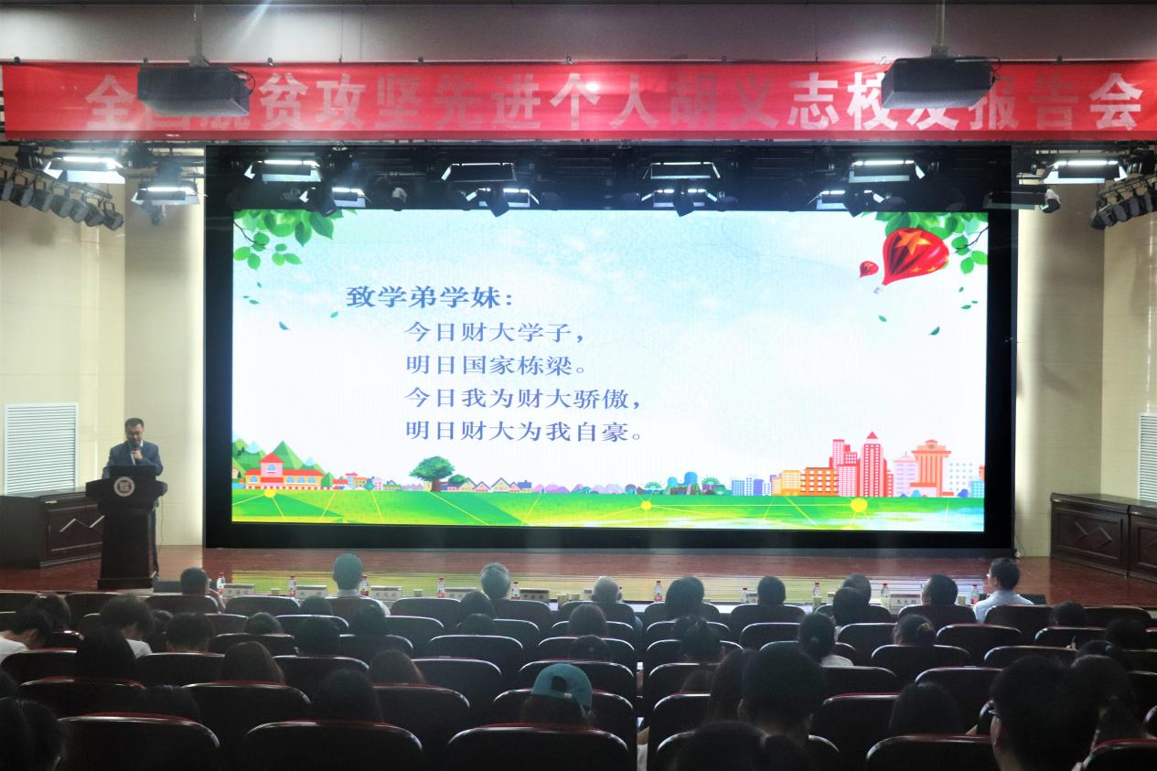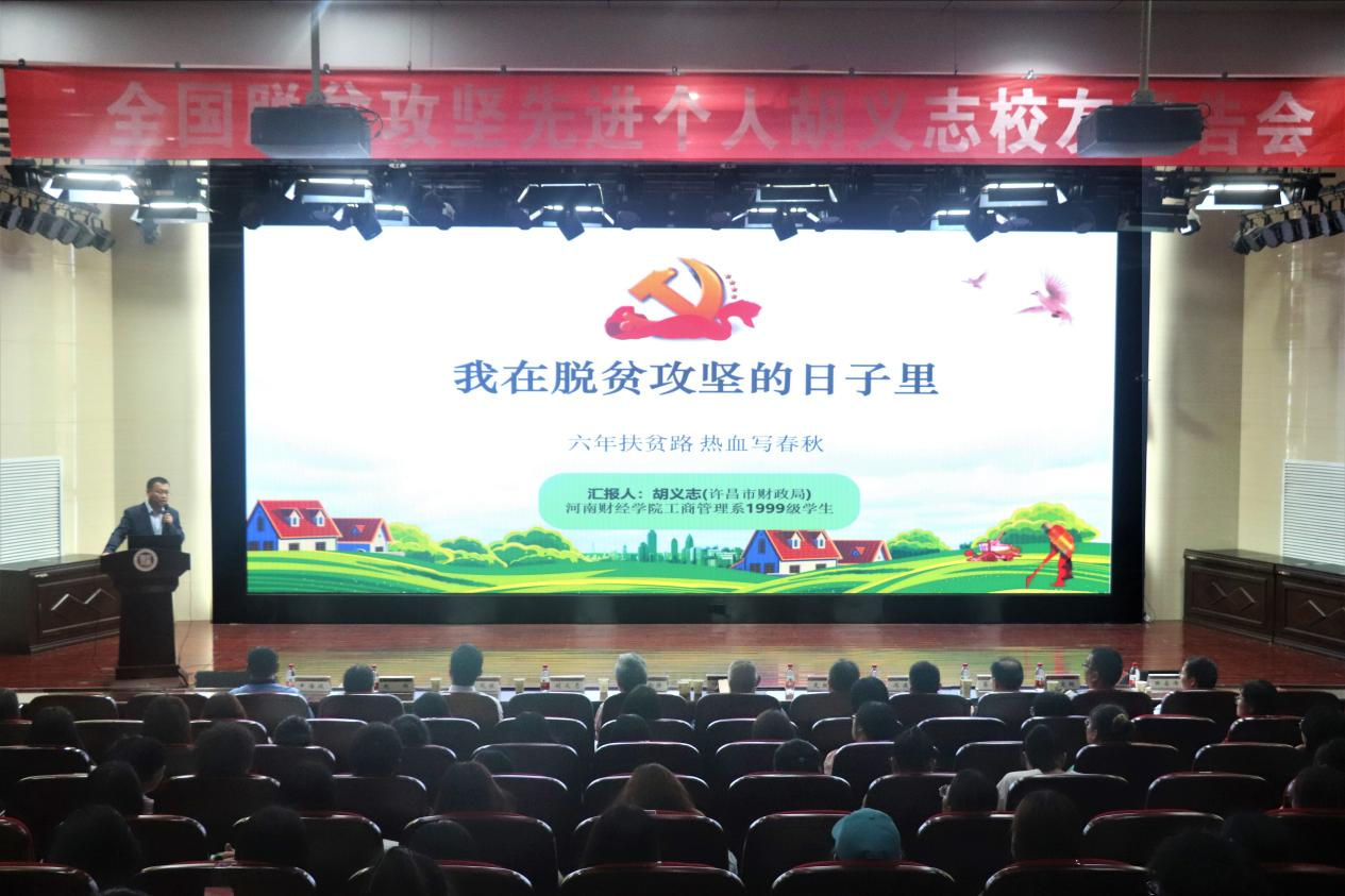 胡义志校友首先感谢学校的邀请,并带领同学们重温校训,希望同学们能从脱贫攻坚精神里汲取营养,珍惜来之不易的幸福生活。随后,他与大家分享了他的脱贫攻坚故事。胡义志供职于许昌市财政局,先后两次奔赴扶贫工作一线,第一次是2015年8月至2018年2月在长葛市长兴办事处孙庄担任驻村第一书记,紧接着是2018年6月到2021年2月,作为成员参与许昌市结对帮扶南阳市淅川县脱贫攻坚工作,挂职淅川县西簧乡党委副书记。6年间,胡义志舍小家为大家,以热血赴使命,以行动践诺言,走村串户,访贫问苦,为群众办实事好事;协调资源,助力乡村经济发展和基层组织建设,造福一方百姓,把美好的青春年华奉献给了国家的扶贫事业,生动诠释了共产党人的初心使命和担当精神。胡义志先后被授予河南省优秀驻村第一书记、全国脱贫攻坚先进个人,在2021年2月25日的全国脱贫攻坚总结表彰大会上,受到习近平总书记等党和国家领导人的接见。他说,总书记庄严宣布“我国脱贫攻坚战取得了全面胜利”,那一刻,我心情激动,无比自豪,我为从事的扶贫事业而骄傲。一个人的青春年华献给人民,一个人的成长融入国家建设、民族复兴的伟业中,这样的人生最有价值。扶贫经历增添的是最靓丽的青春底色,绘就的是最美的人生画卷。胡义志校友的先进事迹赢得了现场阵阵掌声。
