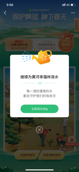 此次线上植树活动以“蚂蚁森林”平台为载体,号召学生在平台种植虚拟树,以增强保护黄河生态的意识。活动期间,志愿者们在支付宝“蚂蚁森林”参与“保护黄河,种下春天”活动,为黄河幸福森林浇水,贡献守护黄河力量。同学们怀着对绿色生命的渴望,投入到线上植树活动中,合种了多棵虚拟树。
