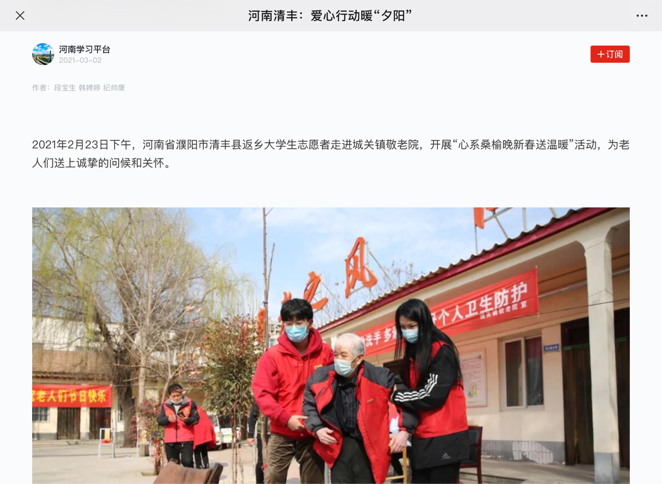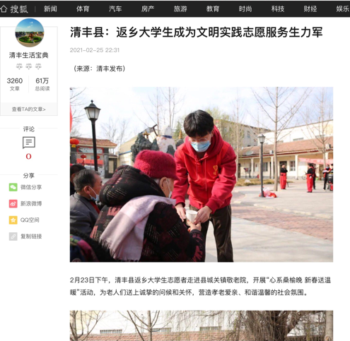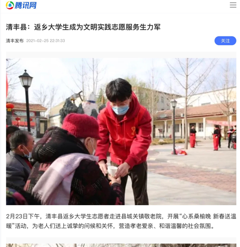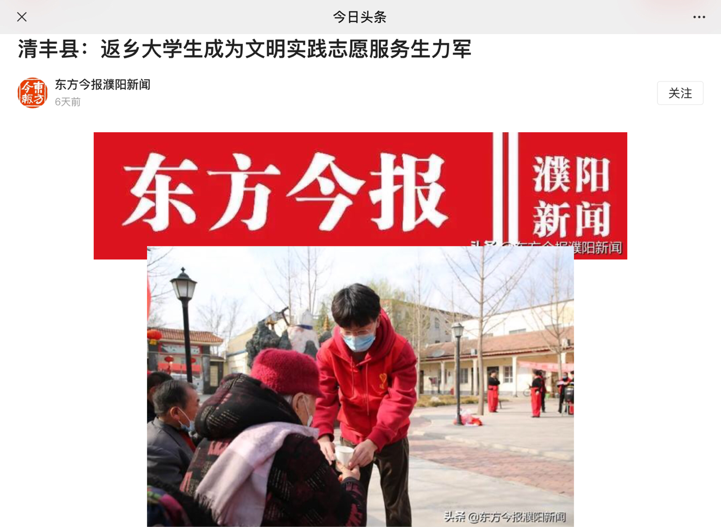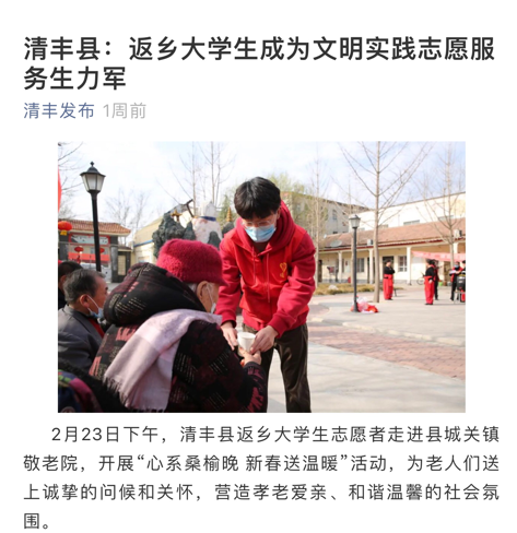 2021年寒假,伟德国际1946bv官网学生纪帅康返乡后积极响应号召,主动申请加入家乡濮阳市清丰县的暖爱志愿服务队,投身于社会文明志愿实践活动,用青春展现责任与担当。
