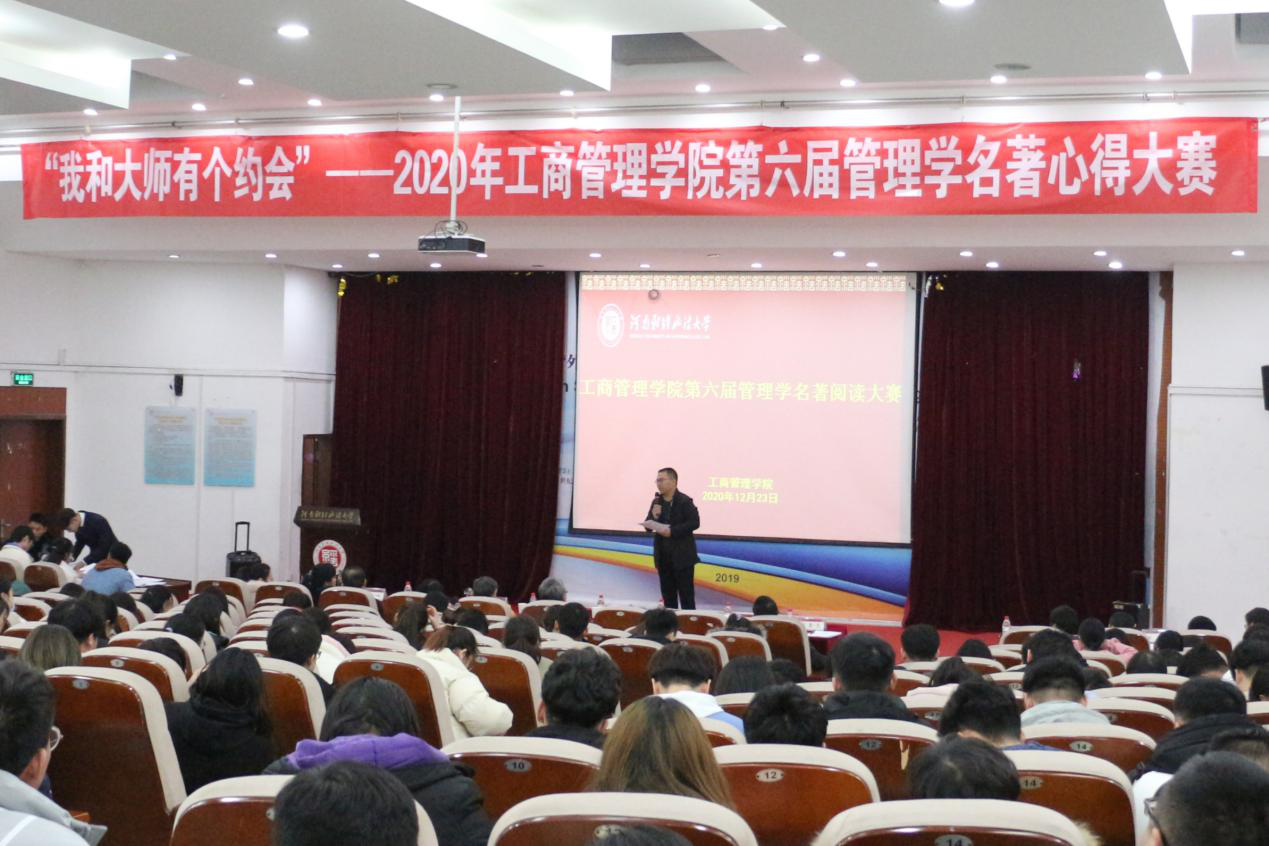 12月23日晚,伟德国际1946bv官网于第一教学楼220报告厅举办第六届“我和大师有个约会”——管理学名著阅读心得大赛。学院党委书记孙向东、院长牛全保,党委副书记赵辉,副院长蔡树堂、王文超及部分教研室老师作为评委出席本次大赛,240余名学生观看比赛。
