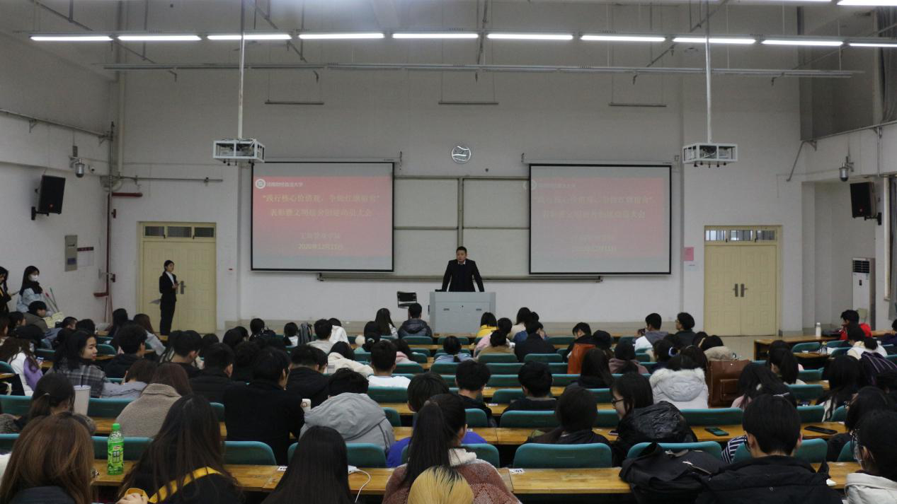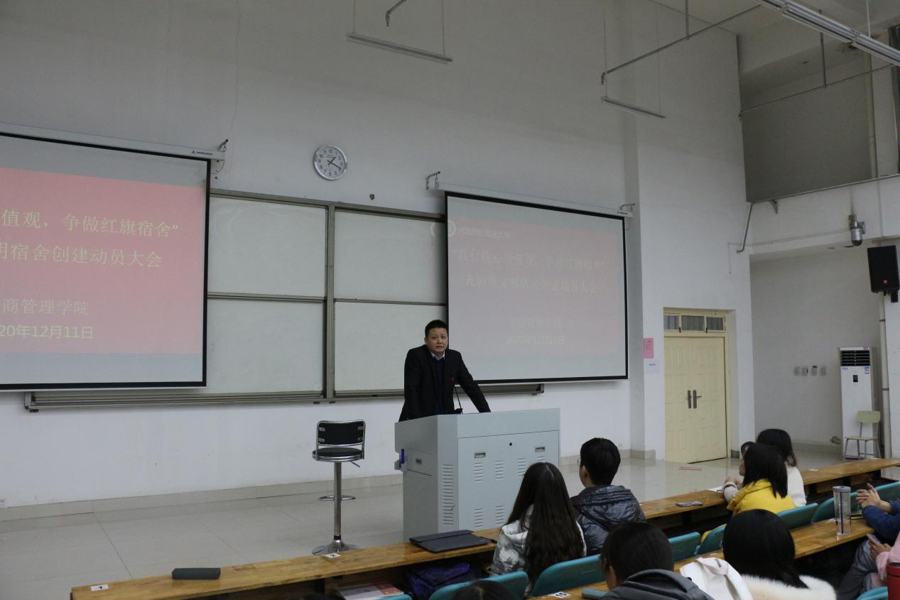 12月11日中午,伟德国际1946bv官网在教科楼B座210教室召开“践行核心价值观,争做红旗宿舍”表彰暨文明宿舍创建动员大会。学院团委书记赵绍春莅临现场,200余名学生参加会议。