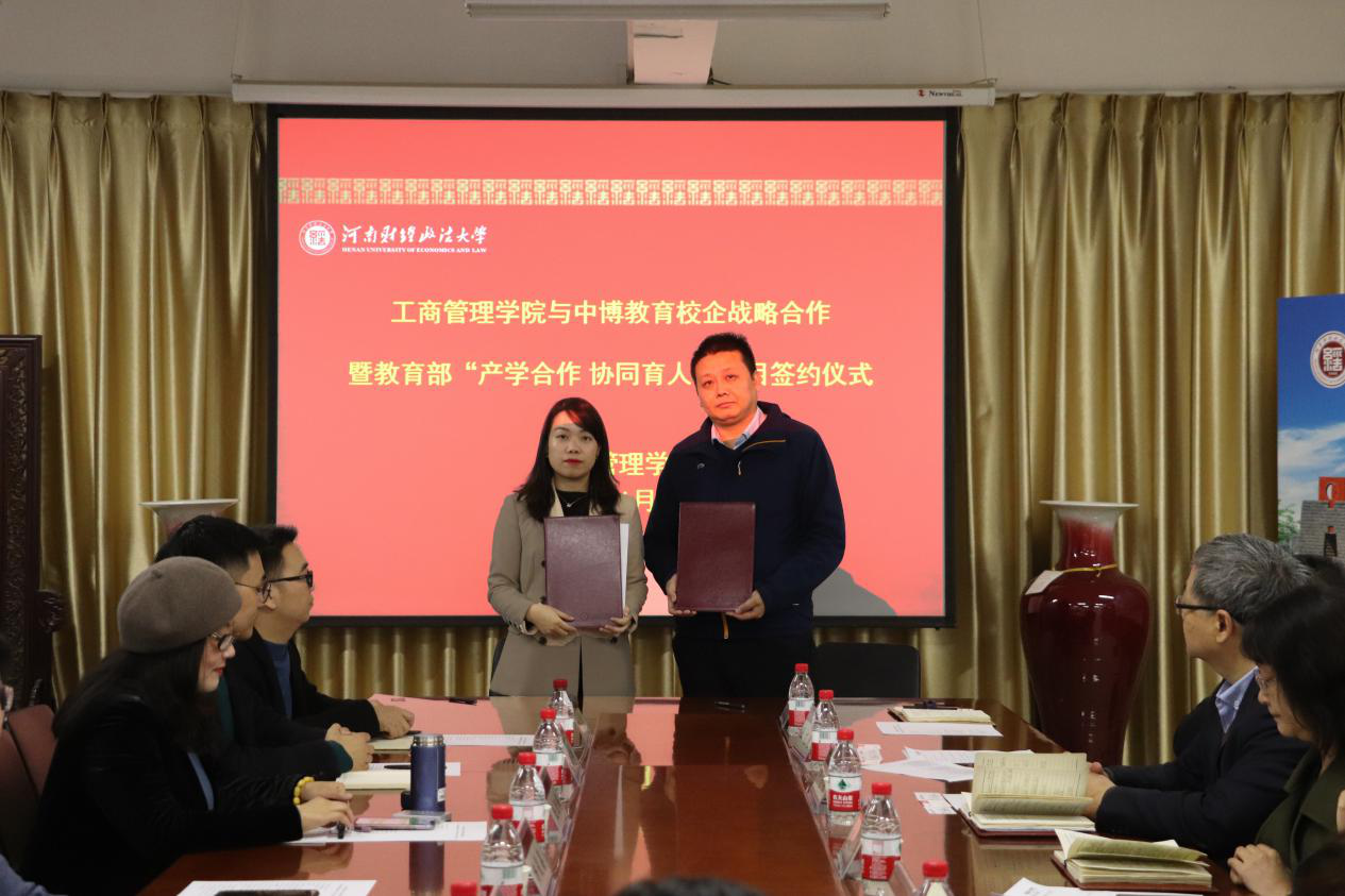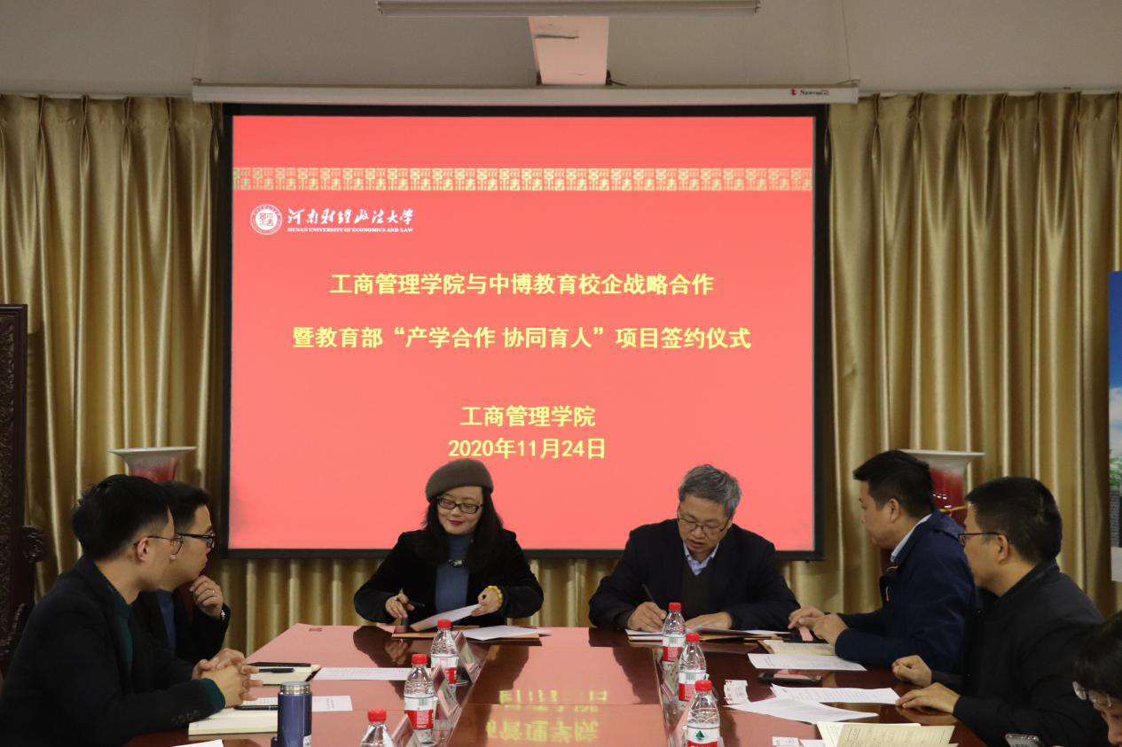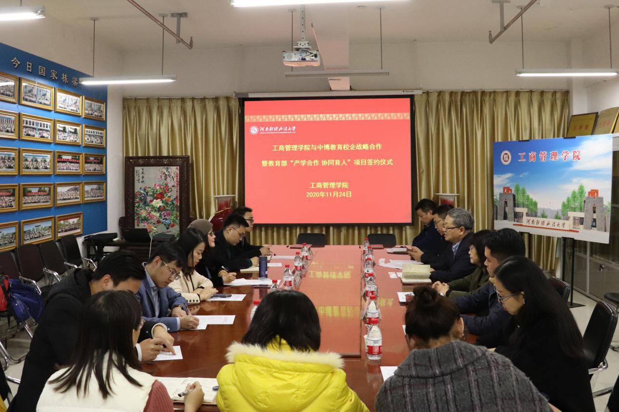 2020年11月24日下午,伟德国际1946bv官网与中博教育股份有限公司(以下简称:中博教育)校企战略合作暨教育部“产学合作,协同育人”项目签约仪式在教科楼771会议室举行。学院院长牛全保、党委副书记赵辉、副院长王文超、中博教育副总裁毛劲梅等双方相关人员参加了签约仪式。