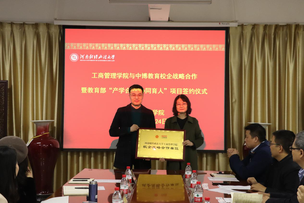 牛全保为签约仪式致辞,他介绍了学院的基本情况和近年来取得的成就。他指出,双方的合作使学校和企业各自的优势得到发挥,人才培养更加符合社会与市场的需求,并特别感谢疫情期间中博公司给学院学生提供的就业支持。这次合作上升到战略层面,合作的内容将更加全面,包括联合培养、师资交流、学生活动、学生就业、科学研究等方面。同时,以教育部“产学合作协同育人”项目签约为契机,双方合作将会更加深入和具体。毛劲梅介绍了中博教育公司的发展历程和今后的发展规划,对学院的支持表示感谢,同时期待更加深入和广泛的合作。最后,双方举行了签约和授牌仪式。