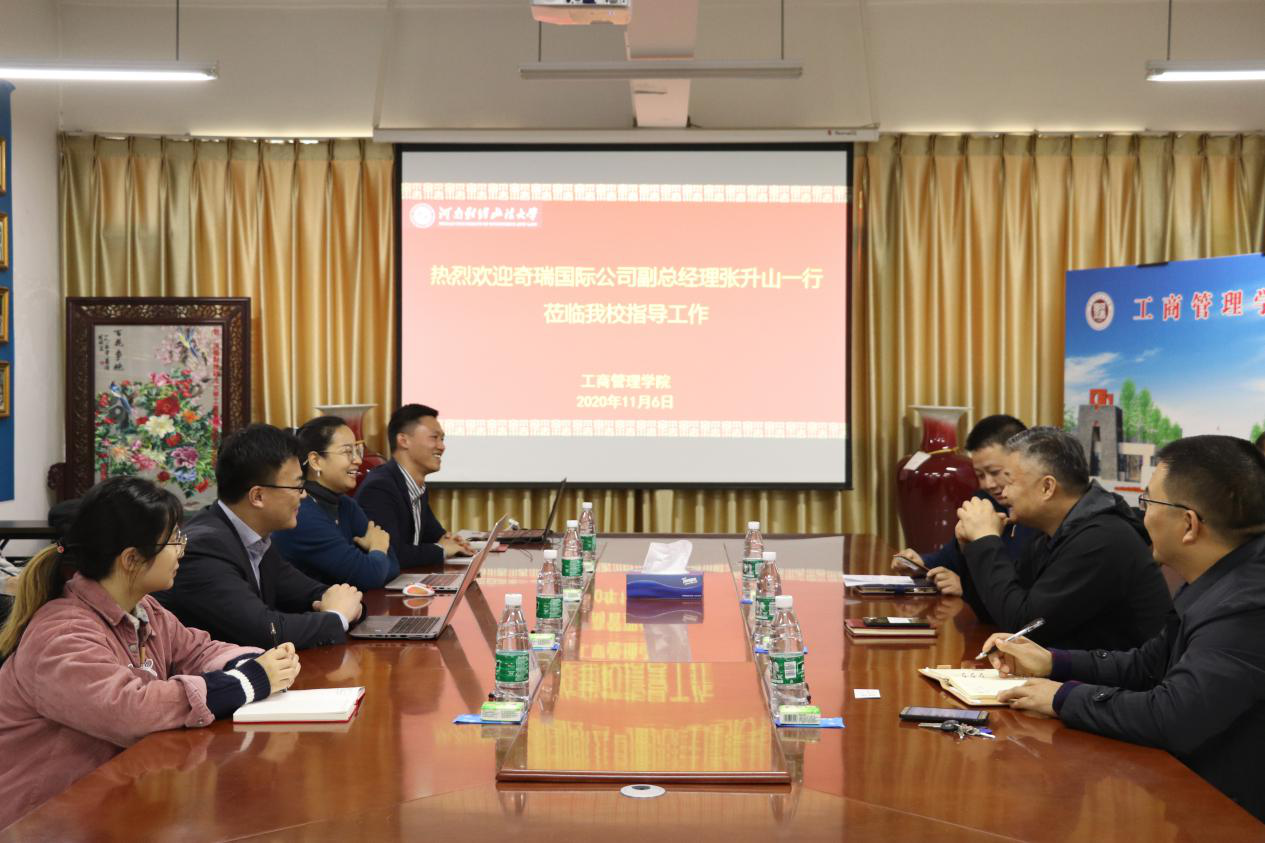 孙向东首先代表学院对张升山一行来访表示热烈欢迎,就进一步加强与奇瑞国际的合作发表意见。王文超介绍了我们学科建设取得的显著成效,以及毕业生的就业情况,希望通过增强学校与企业之间的合作,让学生学以致用,把理论与实践相结合,提升就业能力。张升山介绍了奇瑞国际的长期战略目标、全球业务发展状况等,感谢学校、学院为奇瑞输送了优秀人才,期待与学校、学院开展更多的合作。张洋表达了对母校和奇瑞公司的感恩之情,并欢迎学弟学妹们到奇瑞就职,为振兴民族企业做贡献。