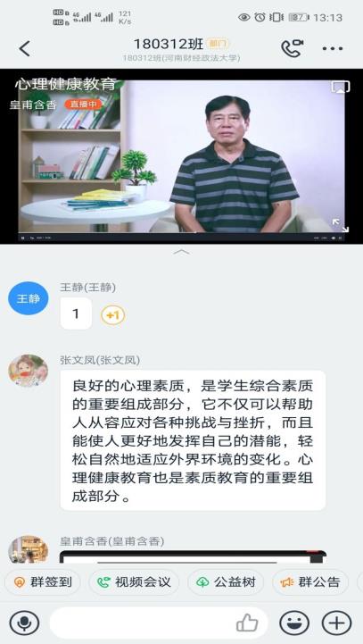 本次活动依托我们在校课堂的共享资源《大学生心理健康与安全教育》课程进行,各班级通过召开钉钉线上班会、钉钉播放心理健康教育视频、互动交流等形式开展此次活动。课程结合在校大学生的实际生活和大学生的普遍特点,主要讲授了心理调适和环境适应的方法,强调在新的学期,应主动适应环境、端正学习态度和合理规划大学生活。讨论环节同学们各抒己见,发言热烈,互相鼓励无论遇到何种困难和压力,都会以乐观的心态坦然面对,勇敢克服。