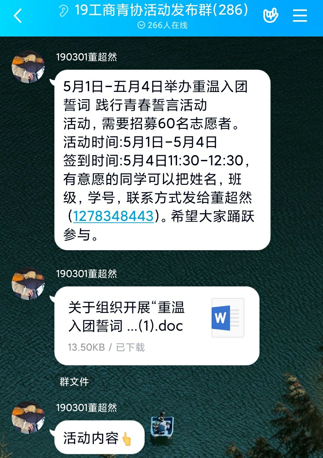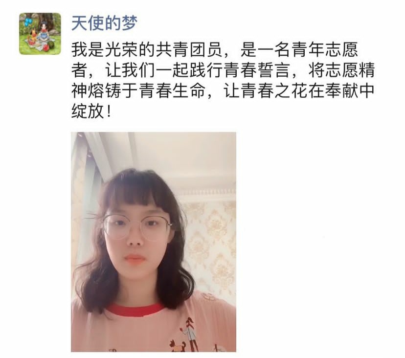 为培养青年的爱国精神和无私奉献的社会责任感,肩负起时代的重任,我们青年志愿者协会于2020年5月1日-4日举办了以“重温入团誓词,践行青春誓言”为主题的线上活动。此次活动共有60名志愿者参加。 回顾1919年的5月4日,青年学生在挽救国家命运的同时,以青春的热血赋予了它特殊的光辉。“爱国、进步、民主、科学”的口号冲天而起,破晓而生。世纪之隔,线上志愿者们再次接力百年之约,以青春之光芒重绘未来新篇。在长达四天的活动里,志愿者们重温入团誓词,录制视频并配以文字“我是光荣的共青团员,是一名青年志愿者,让我们一起践行青春誓言,将志愿精神熔铸于青春生命,让青春之花在奉献中绽放”分享到朋友圈。这是一场别开生面的青春誓言线上接力,志愿者们举起右手,庄严地诵读入团誓词,眼神坚定而自信,言语铿锵有力。 活动落幕之际,志愿者纷纷发表了自己对五四精神的感想。青年需立志,如林则徐所言:“海到无涯天作岸,山登绝顶我为峰”;青年需爱国,青年一代要将爱国情,强国志,报国行融入到生活中,铭记历史,为实现中华民族伟大复兴而奋斗。