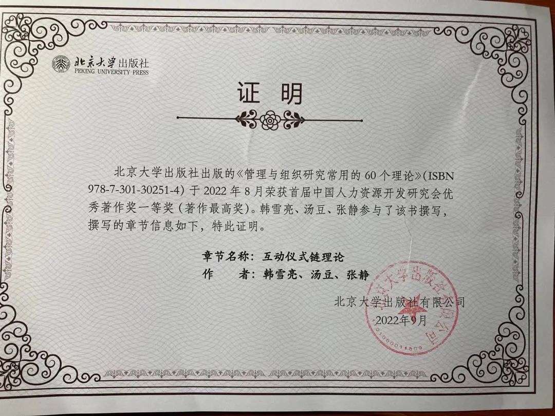 在参与编撰《管理与组织研究常用的60个理论》过程中,韩雪亮带领汤豆、张静两位同学深入研究管理学相关理论,积极克服困难,最终将“互动仪式链理论”编入书中。此次获奖,不仅标志着我们师生科研水平再上新台阶,也将进一步鼓舞专业教师在专业领域继续探索的热情,带动全院师生在科研领域取得新进展。