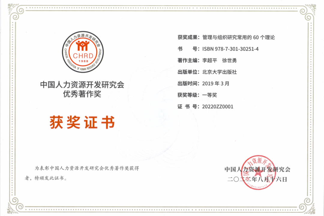 经形式审查、业内专家通信初评、评审委员会复评、研究会终评,评选出了7项优秀著作奖、5项优秀教材奖和6项优秀教学成果奖。我们韩雪亮博士与汤豆、张静两位学生协同全国116名作者撰写的《管理与组织研究常用的60个理论》荣获中国人力资源开发研究会唯一的优秀著作一等奖。
