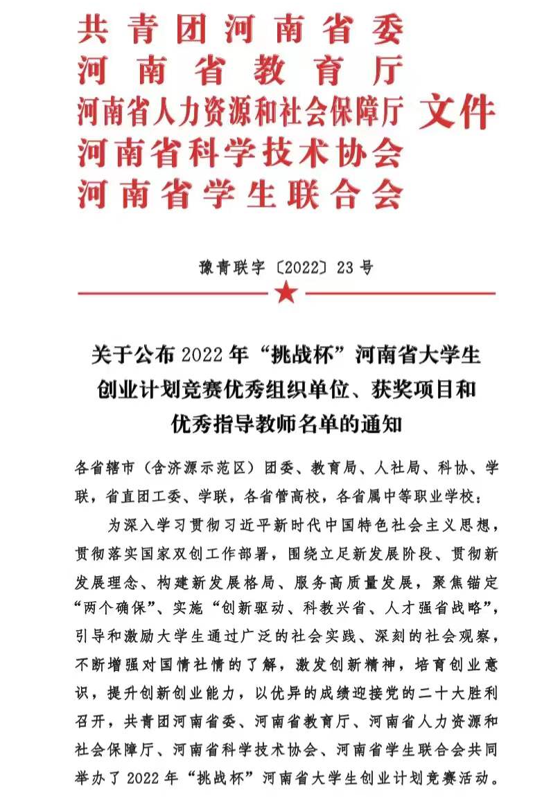 近日,2022年“挑战杯”河南省大学生创业计划竞赛获奖名单公布。我们共有三个项目荣获金奖,其中两个项目来自我们,分别是“昔音——智慧研学履行引领者”、河南曌沣“高分农业”商业计划书,指导教师田启涛、赵绍春荣获2022年 “挑战杯”河南省大学生创业计划竞赛 “优秀指导教师”荣誉称号。