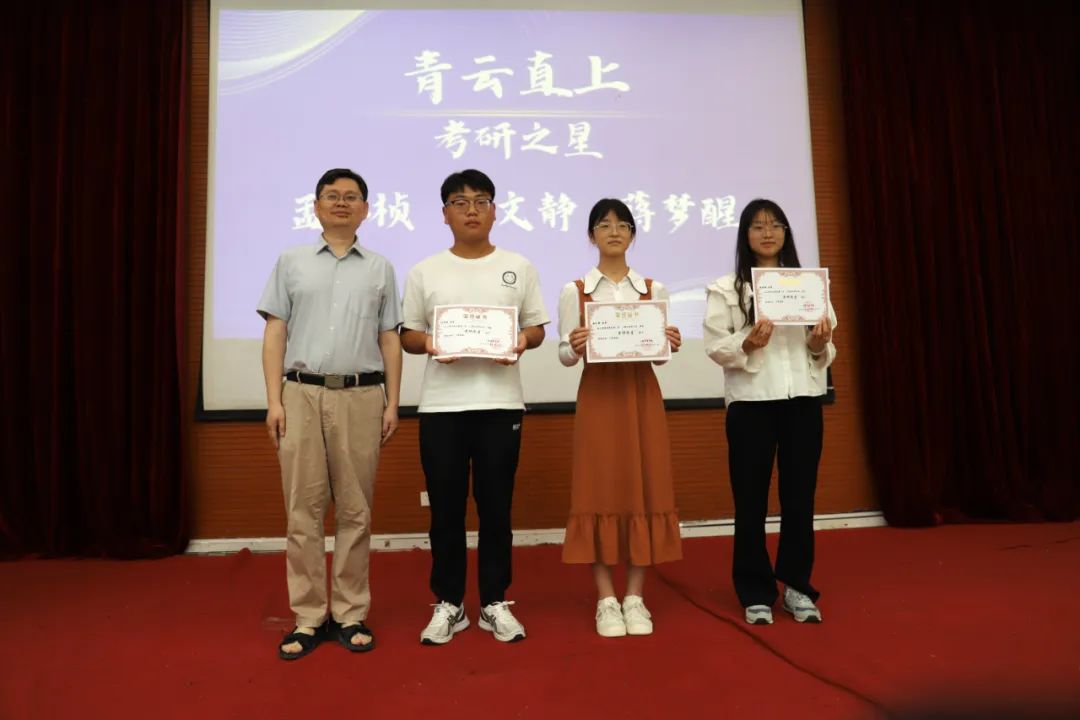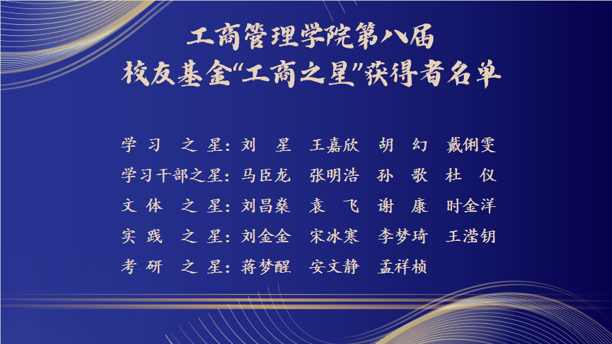 王永伟宣读获奖名单,并向19名获得表彰的同学表示祝贺。刘星、王嘉欣、胡幻、戴俐雯获“学习之星”荣誉称号,马臣龙、张明浩、孙歌、杜仪获得“学生干部之星”荣誉称号,刘昌燊、袁飞、谢康、时金洋获得“文体之星”荣誉称号,刘金金、宋冰寒、李梦琦、王滢钥获“实践之星”荣誉称号,蒋梦醒、安文静、孟祥桢获“考研之星”荣誉称号。他希望同学们走向社会后像优秀校友一样,关心关爱每一位在校工商学子。