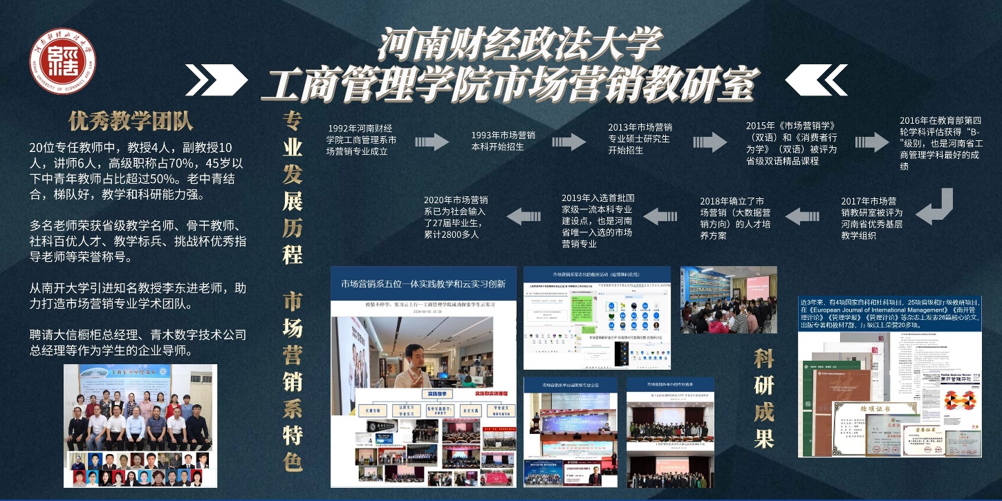 伟德国际1946bv官网市场营销系,成立于1992年,前身是河南财经学院工商管理系市场营销教研室。1993年,市场营销本科专业开始招生,是河南省第一个市场营销本科专业,也是全国高等院校第一批开设市场营销本科专业。2013年,市场营销专业硕士研究生开始独立招生。目前,市场营销专业拥有二级学科硕士学位授权点,也是省级特色专业。2016年在教育部第四轮学科评估中获得“B-”级别,也是河南省工商管理学科最好的成绩。2017年市场营销教研室被评为河南省优秀基层教学组织。2018年,确立了市场营销(大数据营销方向)的人才培养方案。2019年,入选首批国家级一流本科专业建设点,也是河南省唯一入选的市场营销专业。截止2021年,市场营销系已为社会输送了24届毕业生,累计3000余人。