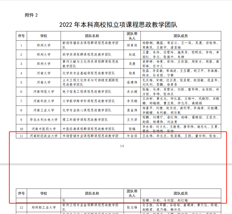 2022年11月27日,教育厅公布《河南省2022本科高校课程思政项目评审结果》,我们共获得8项省级课程思政项目立项,我们获得2项。《市场营销专业课程群课程思政教学团队》(团队带头人:牛全保,团队成员:王永伟、李志兰、张亚佩、王凯、董伶俐、张佳、张娜、孙彪、马田园、赵红瑞)获得河南省课程思政教学团队,《管理学》(负责人:王凯,团队成员:王永伟、王建军、陈钢、陈慧慧、郭萌萌)获得河南省课程思政示范课程。至此,我们共获得4项省级课程思政建设项目,1项部级课程思政研究项目和1项研究生课程思政建设项目,课程思政建设成果显著。