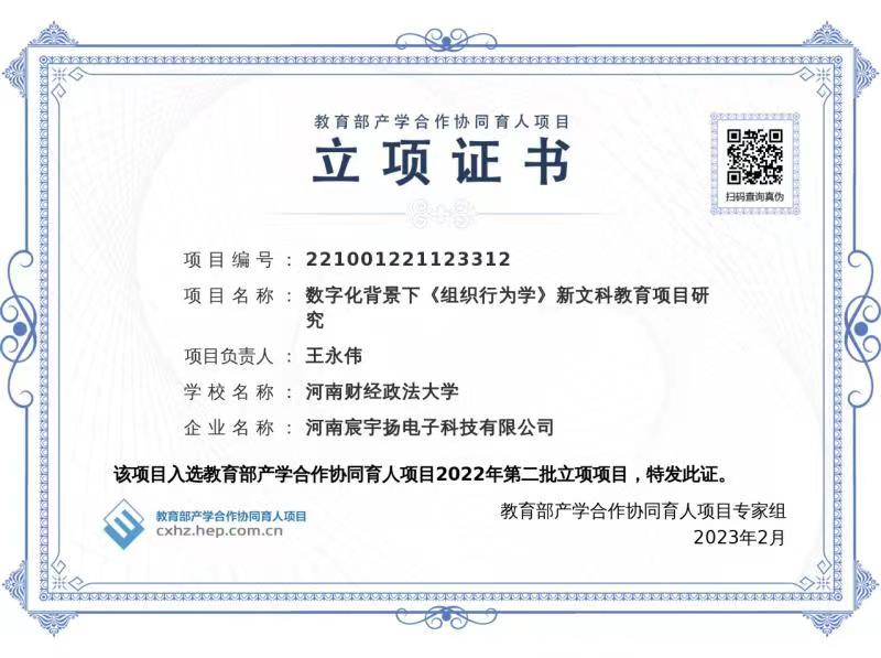 近日,教育部高等教育司公布了2022年第二批产学合作协同育人项目立项名单,院长王永伟博士主持的“数字化背景下(组织行为学)新文科教育项目研究”(项目编号:221001221123312)获得立项,项目合作方为“河南寰宇扬电子科技有限公司”,这是我们连续第二年获批教育部协同育人项目。