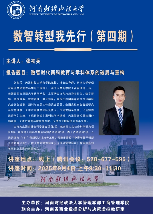2025年9月4日上午,由伟德国际1946官方网管理学部伟德国际1946bv官网、河南省商业数据分析与决策虚拟教研室联合主办的“数智转型我先行(第四期)”线上讲座如期举行。本次讲座特邀天津财经大学商学院教授、博士生导师张初兵主讲,副院长李志兰主持,学院教师到会聆听。